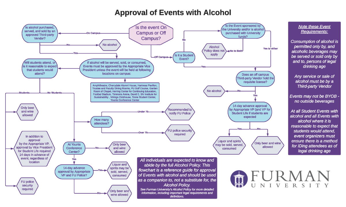 Approval for the Service, Sale, or Consumption of Liquor or Spirits. When approved 14 days in advance by the Appropriate Vice President and Furman University Police, liquor and spirits may be sold, served, and consumed at Events at Younts Conference Center at which students will not be present. When approved 14 days in advance by the Appropriate Vice President (and the Vice President for Student Life, for Events that it would be reasonable to expect that students would attend), liquor and spirits may be sold and served at Events Off Campus.